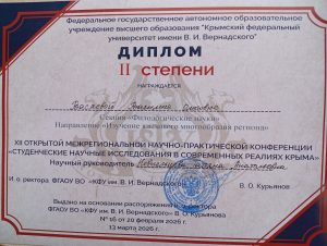 13 марта 2026 г. в Таврическом колледже КФУ (г. Симферополь) состоялась XII открытая региональная научно-практическая конференция «Студенческие научные исследования в современных реалиях Крыма», посвященная 12-ой годовщине воссоединения Крыма с Россией. Целью конференции является пропаганда результатов научных и практических исследований обучающихся средних профессиональных учебных заведений в сфере гуманитарных и экономических наук, информационных технологий и естественнонаучных направлений; установление контактов между студентами различных учебных заведений; обмен научными результатами и исследовательским опытом за 12 лет в составе Российской Федерации. В этом году программа конференции состояла из 7 секций, которые работали по 20 направлениям, доклады оценивали 33 эксперта, всего было 178 участников из 9 образовательных учреждений. Наш колледж, в секции «Филологические науки», направление «Изучение языкового многообразия региона», представляла Васяева Василиса (гр. 1-Сбо, руководитель Новосельцева Т.А.). По итогам конференции она была награждена дипломом II степени.